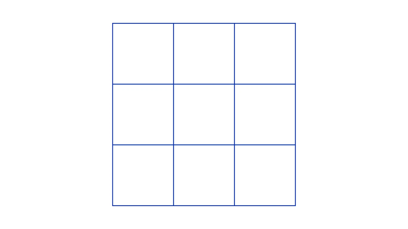 Masz swoją odpowiedź? Zanim sprawdzisz, czy jest prawdziwa, upewnij się, że policzyłeś wszystkie możliwe konfiguracje. Podpowiedź: na rysunku znajdują się kwadraty o różnych rozmiarach, a te, które wydają się tylko liniami pomocniczymi, również kryją niespodzianki. Prawidłowa odpowiedź to... 14. Tyle kwadratów znajduje się na rysunku — 9 małych, 4 złożone z czterech małych i 1 duży (całość).