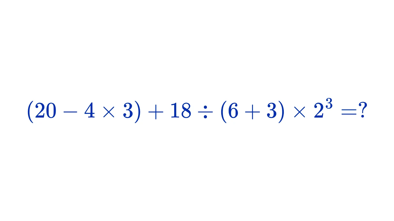 Zgodnie z kolejnością wykonywania działań zaczynamy od nawiasów. W pierwszym z nich znajduje się odejmowanie oraz mnożenie, więc w pierwszej kolejności mnożymy 4 × 3 = 12, a następnie odejmujemy 20 - 12 = 8. Z kolei w drugim nawiasie mamy jedynie dodawanie: 6 + 3 = 9. Następnie podnosimy 2 do potęgi 3 i otrzymujemy 8. W tym momencie nasze działanie wygląda następująco: 8 + 18 / 9 × 8. Ponownie sięgamy do kolejności wykonywania działań i obliczamy dzielenie oraz mnożenie od lewej do prawej strony: