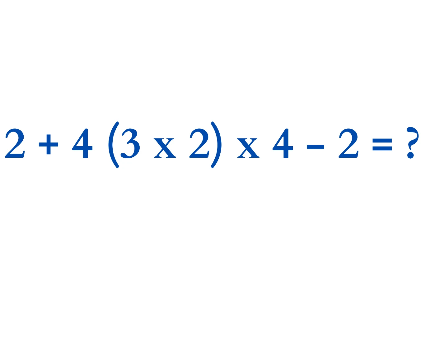 Potem przechodzimy do mnożenia i dzielenia, wykonując je od lewej do prawej. Na końcu liczymy dodawanie i odejmowanie. Wystarczy tyle zapamiętać, aby rozwiązać tę zagadkę w krótkim czasie. Stosując więc tę zasadę w praktyce, należy wykonać następujące kroki, aby uzyskać wynik działania 2 + 4 (3 x 2) x 4 - 2. Oto one: