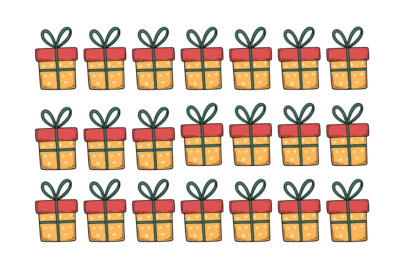 Na ilustracji widzisz 21 prezentów ułożonych w 3 rzędach po 7 w każdym. Wszystkie wyglądają niemal identycznie: dół prezentu jest pomarańczowy z białymi gwiazdkami, góra jest czerwona i każdy prezent ma zieloną wstążkę. Z pozoru to kopie jeden do jednego. Jednak jeden prezent różni się drobnym, ale kluczowym detalem.