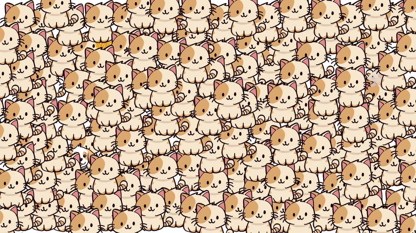 Większość osób, gdy rzuci okiem na ten obrazek, widzi jedynie ogromną liczbę kotów. I to jest oczywiście prawda. Podstawą tego typu zagadek jest stworzenie wrażenia, że na ilustracji nie ma żadnych niepasujących elementów. Tylko wprawne oko i spostrzegawczy umysł odnajdą te różnice, które są naprawdę dobrze schowane. Znajdź kilka minut na skupienie, dokładnie przeskanuj cały obrazek i odnajdź 3 niepasujące elementy. Podpowiedź: jest to mysz, pies oraz... kłębek wełny. Udało ci się je znaleźć?