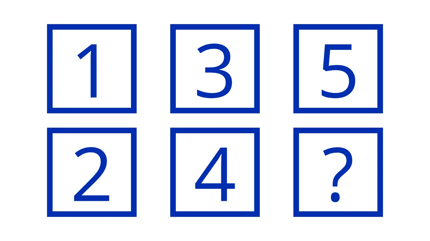 Patrząc na ten zestaw cyfr, od razu na myśl przychodzi nam jedno rozwiązanie i jest nim cyfra 6. Argumentacji tego wyboru może być kilka. W górnym rzędzie bez wątpienia widzimy trzy pierwsze liczby nieparzyste, czyli takie, których nie można podzielić przez dwa bez reszty. Z kolei dwie pierwsze liczby w dolnym rzędzie to przedstawiciele liczb parzystych, czyli takich, które można podzielić przez dwa bez reszty. Czy w takim razie kolejna liczba także będzie liczbą parzystą? Z tej reguły wynikałoby, że będzie to 6. Jednak nie jest to prawidłowa odpowiedź.