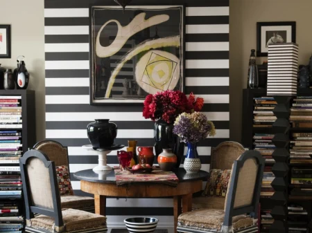 Tapety w paski współcześnie najlepiej sprawdzają się w połączeniu z naturalnymi materiałami tj. jasne drewno czy dodatkami w stylu vintage, które jeszcze bardziej podkreślają nawiązanie do przeszłości.
