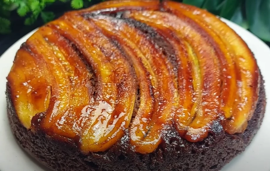 Tak przygotowaną masę wylewamy na banany i dopiero wtedy włączamy palnik. Ciasto bananowe pieczemy na patelni przez około 25 minut. Na koniec należy sprawdzić jego stan wykałaczką. Gdy ciasto jest suche w środku, to przerzucamy je na talerz dołem ku górze, aby wyeksponować skarmelizowane banany.