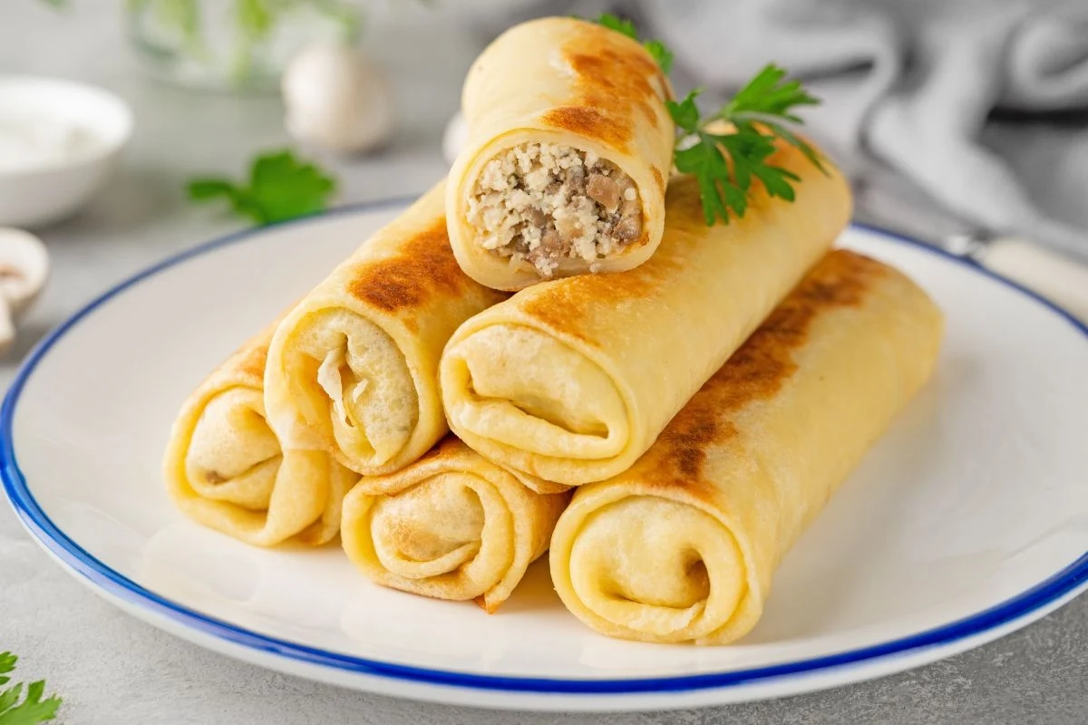 Wymieszaj wszystkie składniki na gładkie ciasto i odstaw je na pół godziny, aby mąka dobrze napęczniała. Rozgrzej patelnię, wlej porcję ciasta i smaż cienkie naleśniki z obu stron, aż nabiorą złotego koloru. Jeśli zauważysz, że zaczynają przywierać, delikatnie posmaruj patelnię olejem. Gotowe placki wypełnij ulubionym farszem, na przykład kremowym serkiem i wędzonym łososiem lub mięsem, a następnie zwiń je w rulony. Podawaj na zimno jako sycące śniadanie, lekki lunch albo efektowną przekąskę na spotkaniu ze znajomymi.