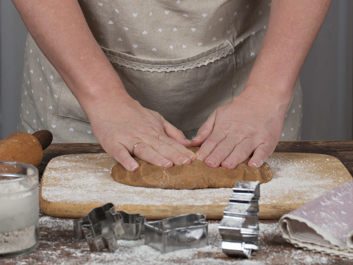 Po tym czasie schłodzone ciasto przekładamy na blat kuchenny oprószony mąką. Dzielimy je na 3 części i każdą z nich wałkujemy na grubość 4-5 mm. Foremkami wykrawamy pierniczki i kładziemy je na blaszce wyłożonej papierem do pieczenia, zachowując 2-3 cm odstępu.