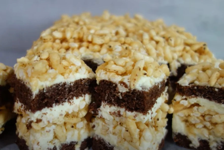 Ciasto z preparowanym ryżem wyrasta wysokie, przekładamy je kremem oraz ryżem preparowanym z masą krówkową. Te nadzienia rozpływają się w ustach. Dodatkowo przygotowanie wypieku nie jest skomplikowane.