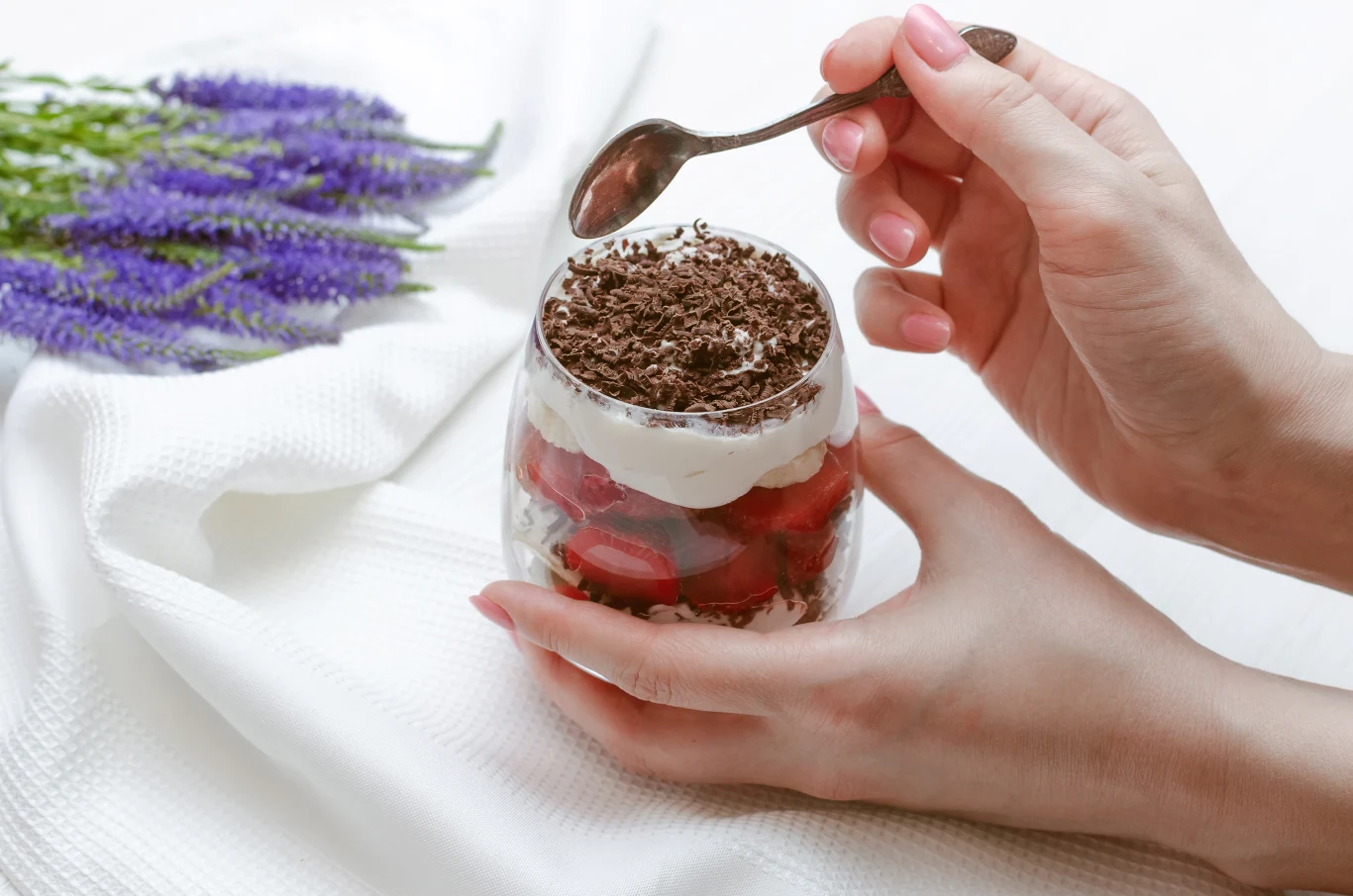 Żeby zrobić deser na Dzień Kobiet, na początek myjemy truskawki i usuwamy z nich szypułki. Kroimy je w ćwiartki, a banana w plasterki. Z kolei herbatniki kruszymy, a w misce mieszamy jogurt z miodem.