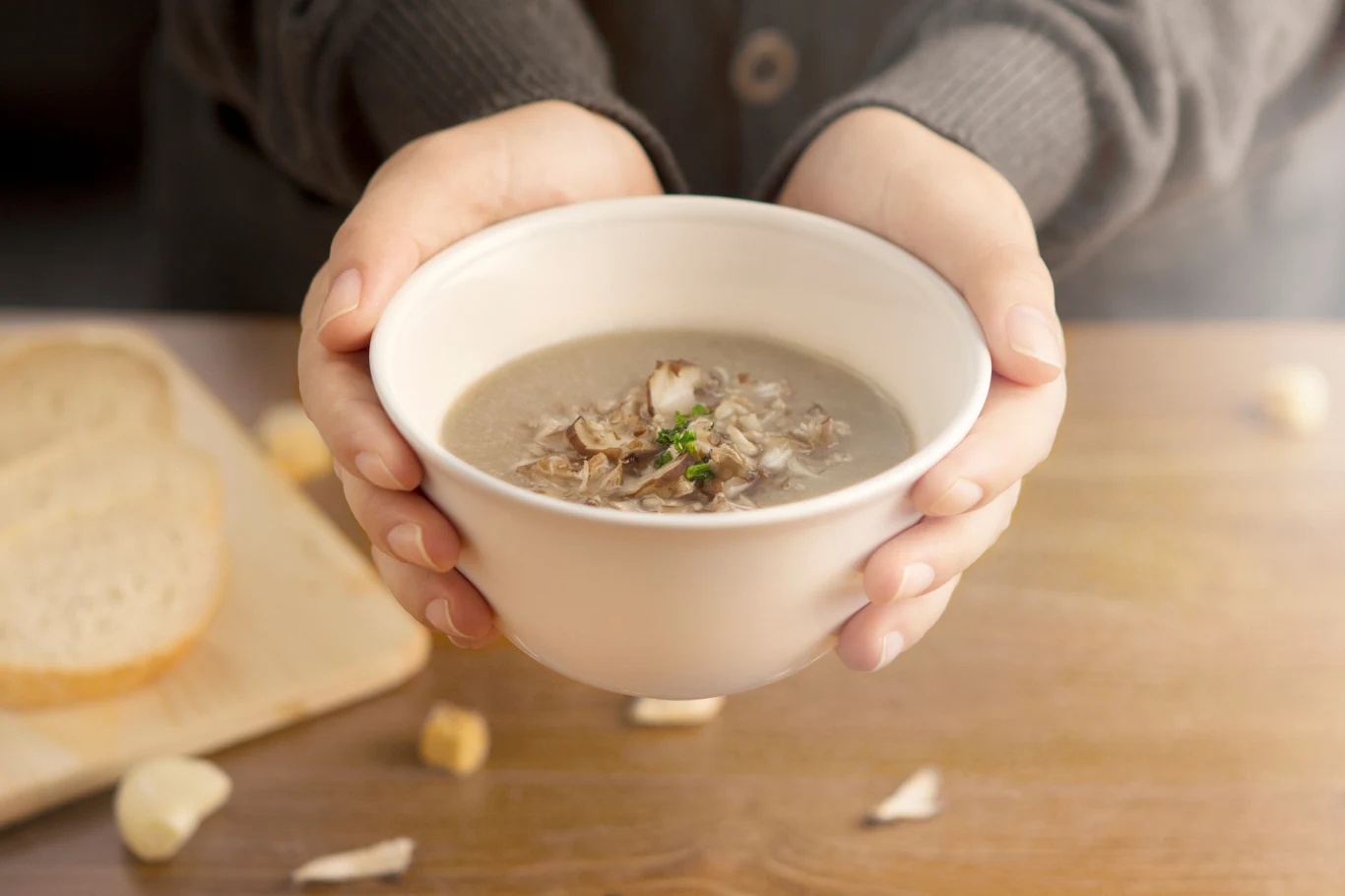 Zupę grzybową podawaj z kaszą lub makaronem i odrobiną śmietany.