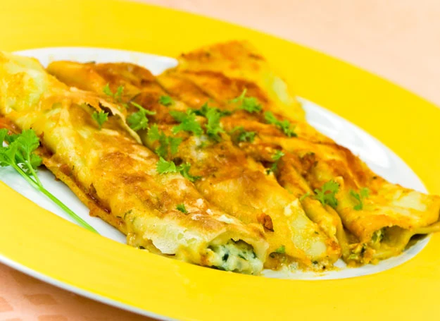 Mocno rozgrzej patelnię naleśnikową. Jeśli używasz takiej z powłoką nieprzywierającą, nie musisz dodawać tłuszczu, w innym przypadku wylej jedną łyżkę oleju. Wylewaj ciasto na patelnię za pomocą chochelki i smaż z obu stron na złoty kolor. Gotowe naleśniki odkładaj na talerz. Na usmażonego naleśnika wyłóż porcję farszu i zawiń jak krokieta. Możesz podawać naleśniki od razu, podsmażyć na maśle klarowanym lub zapiec.