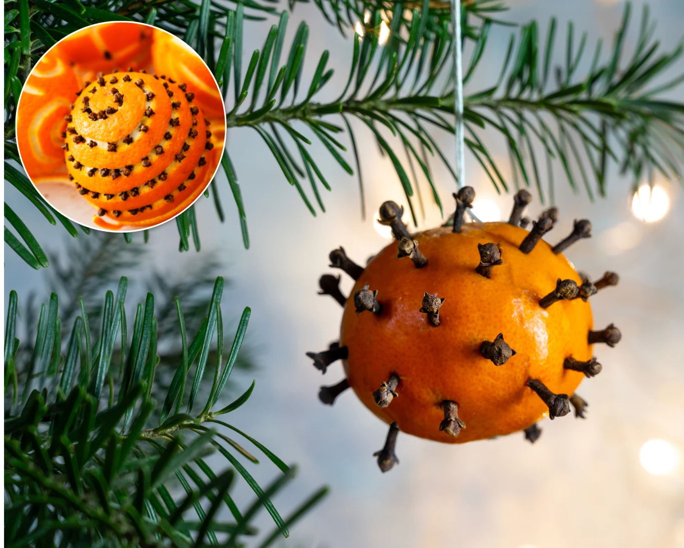 Możesz powiesić zasuszone plastry pomarańczy z goździkami na choince, albo po prostu ponakłuwać nimi pełne owoce i zawiesić na sznurku tj. bombki czy inne ozdoby.