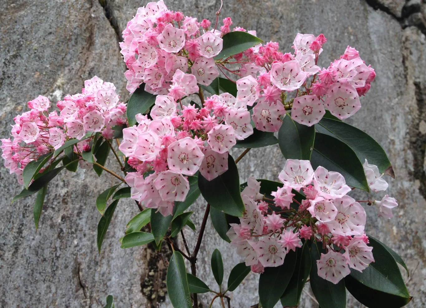 Kalmia szerokolistna jest zimozielonym krzewem ozdobnym, który ma duże ciemnozielone liście, osiągające do 10 cm długości. Jednak to nie one są najciekawszym elementem rośliny. Wzrok przyciągają piękne kwiaty kalmii, których jest po 30-40 w kwiatostanach.