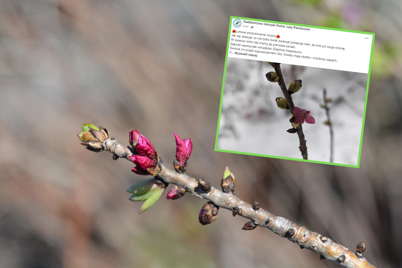 Choć w kalendarzu pora roku zmieni się dopiero 20 marca, to już 5 lutego w sieci pojawiły się zdjęcia kwitnących kwiatów – zdjęcia zrobione w polskich górach, a do tego wcale nie z przebiśniegami w roli głównej. To, co mieli okazję zaobserwować leśnicy z nadleśnictwa Ustrzyki Dolne to pierwsze kwiaty na gałązce wawrzynka wilczełyko, niezbyt rozłożystego krzewu, który zwykle nie przekracza metra wysokości.