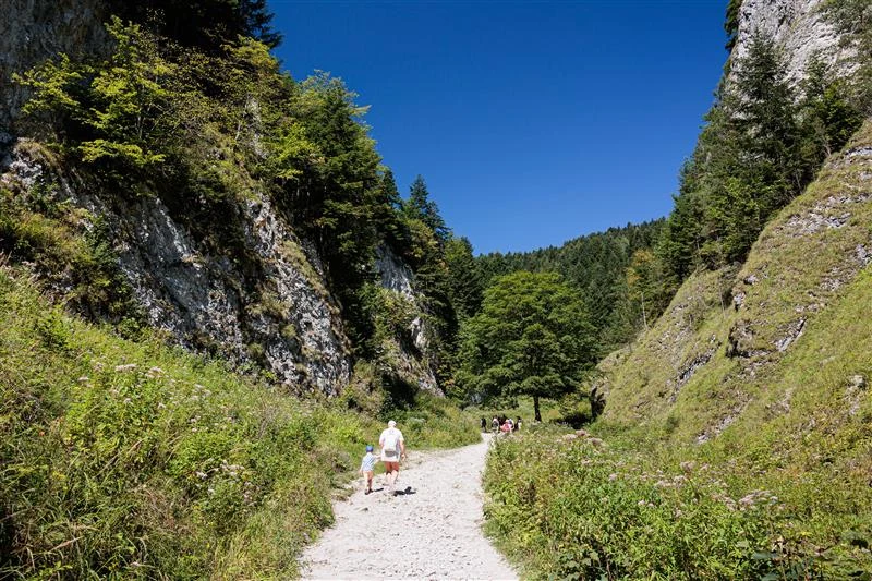 Później trasa prowadzi nas szeroką i komfortową ścieżką, wzdłuż której co jakiś czas płynie Szopczański Potok, przyjemnie szumiąc i umilając spacer. Cały szlak wynosi około 2,5 km w jedną stronę. Możemy go jednak modyfikować zgodnie ze swoimi upodobaniami. Można go skrócić lub wydłużyć, ponieważ po około 5,5 km dotrzemy do Krościenka nad Dunajcem.