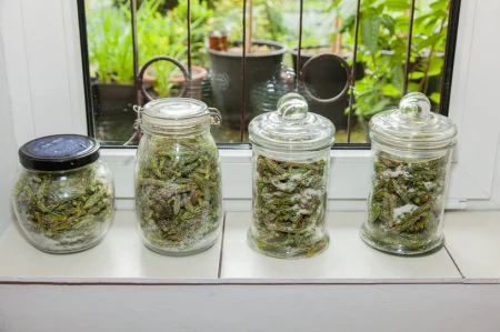 - W dużym słoiku układaj warstwę pędów i warstwę cukru.