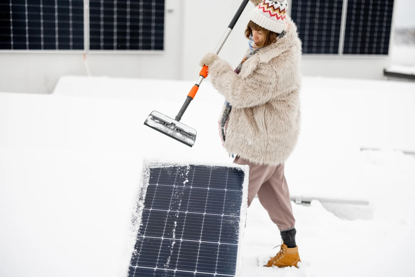 Panele fotowoltaiczne powinniśmy odśnieżać szczotką z miękkim włosiem lub miotłą. Śnieg należy zgarniać delikatnie, dbając też o własne bezpieczeństwo. Wspinanie się na dach zimą może być niebezpieczne. Jeśli więc warunki są niesprzyjające, lepiej zamówić specjalistyczną ekipę, wyposażoną w odpowiedni sprzęt, dzięki któremu szybko pozbędzie się białego puchu.