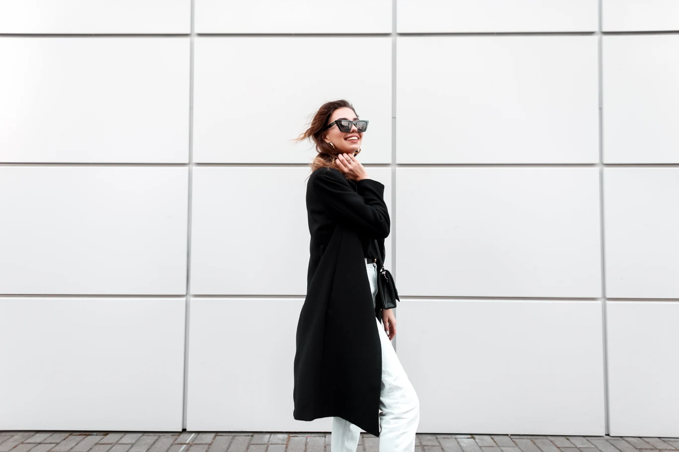W odcieniu czarnym bądź białym świetnie sprawdzi się duża marynarka. Z pewnością będzie dobrym wyborem w chłodniejsze dni. Nada również elegancji. Wysokie szpilki dopełnią całą stylizację, dodatkowo optycznie wyszczuplając sylwetkę.