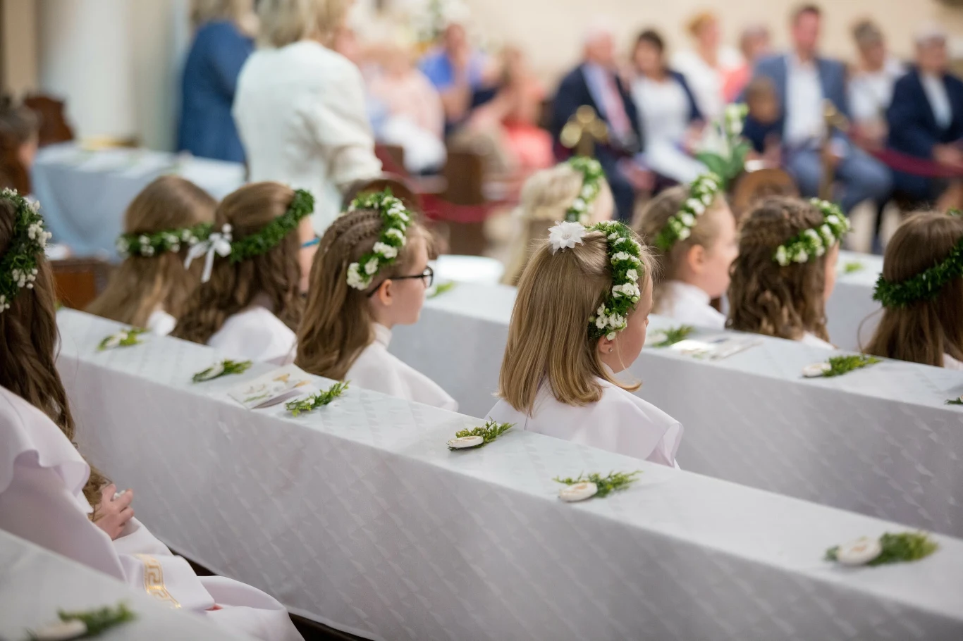 Twoja córka nie chce koków i wysokich upięć na komunię? W takim razie postaw na loki z uczesaniem przypominającym warkoczykowy wianek. Nie zapomnijmy o dekoracjach w postaci żywych lub sztucznych kwiatów, które dodadzą uroku całej fryzurze.